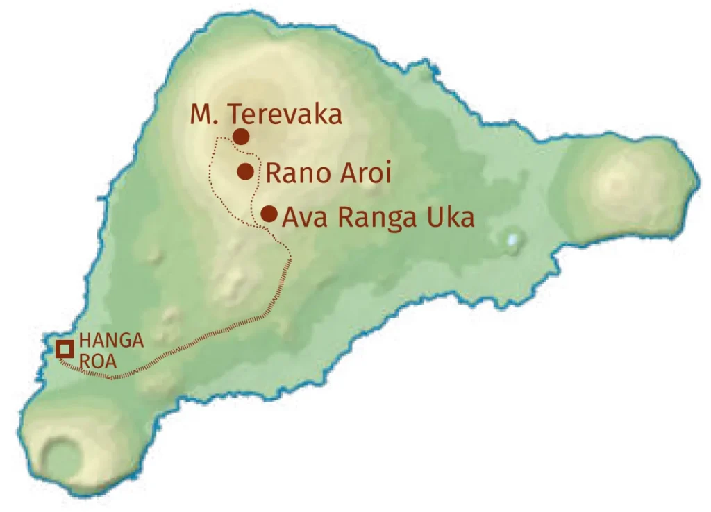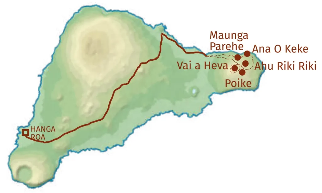 Travesía un poco más extrema que el resto por un rincón muy poco visitado: el reservorio tallado de Vai a Heva, cumbre a 400 m, moai blancos de traquita en Ahu Riki-Riki, la enigmática cueva de Ana o Keke ligada al ritual del Hombre Pájaro y cierre en Maunga Parehe, con vistas a un volcán partido por la erosión marina.
