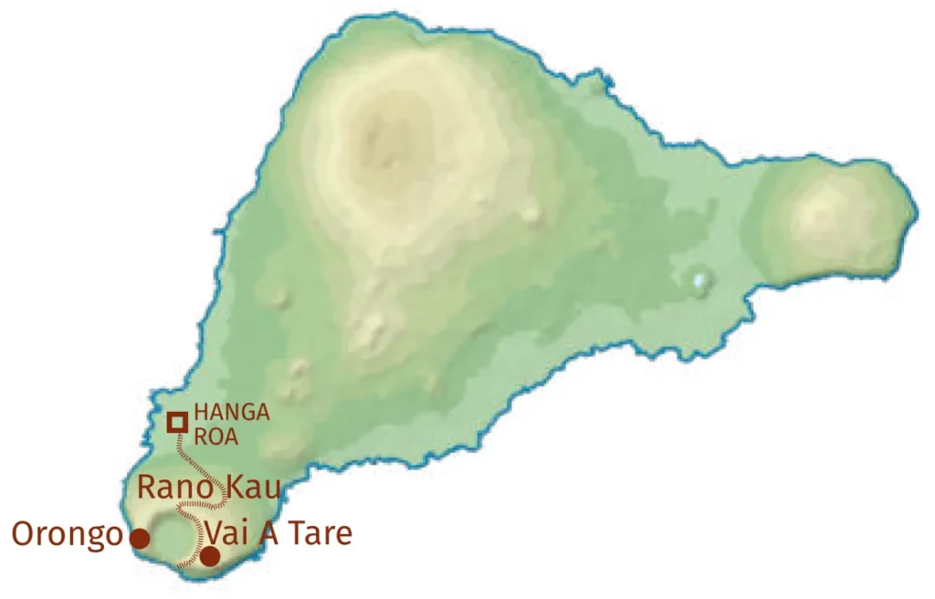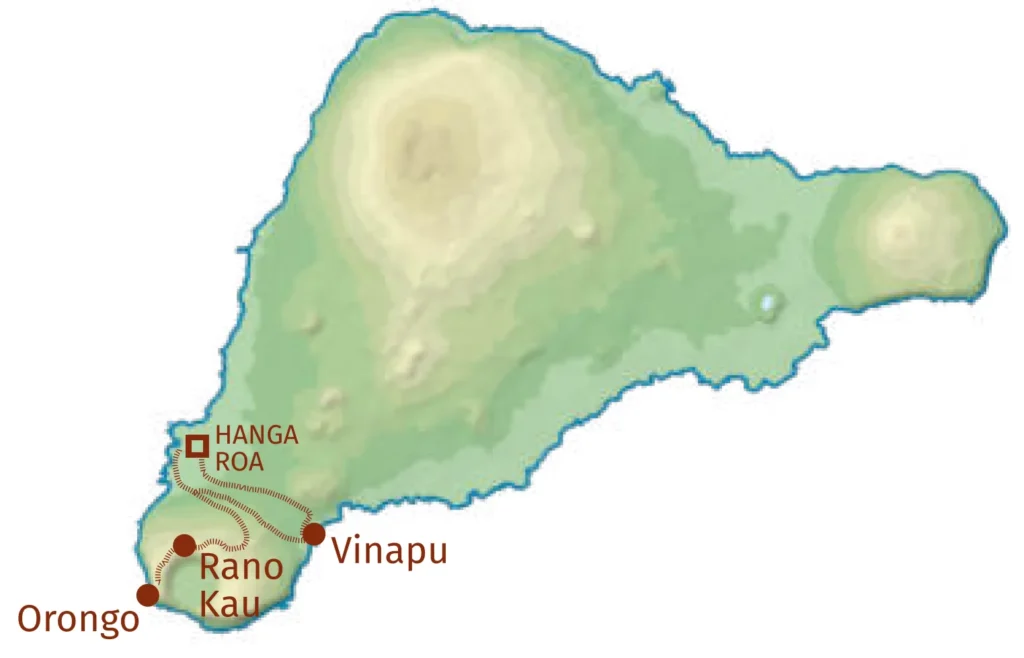 Salida rumbo al volcán Rano Kau para asomarse a su caldera, paisaje icónico y antigua despensa de agua y alimentos. Luego, la aldea ceremonial de Orongo revela el mundo del Hombre-Pájaro y su peso político-religioso. El circuito cierra en Vinapu, al pie del volcán, donde un ahu o templo megalítico único en la isla —comparado con técnicas incas— y una rara figura femenina despiertan preguntas sobre los vínculos entre Polinesia y Sudamérica.